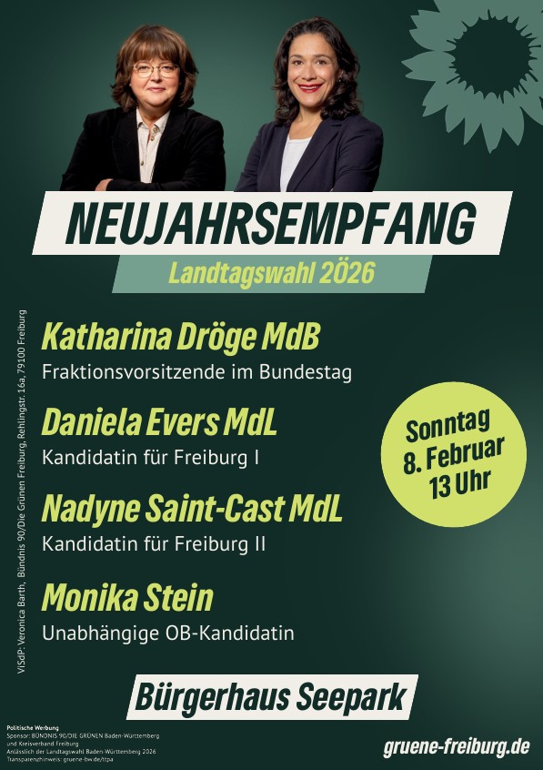 Wir freuen uns auf Beiträge der Bundesfraktionsvorsitzenden Katharina Dröge sowie der Freiburger Landtagskandidatinnen Daniela Evers und Nadyne Saint-Cast.